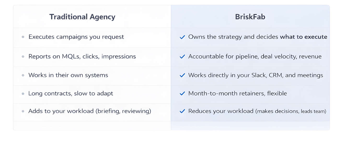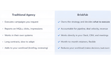 BriskFab provides senior CMO/CRO leadership and revenue operations that own your pipeline from positioning to close. For B2B SaaS companies $1M–$20M ARR with a product, a team, and a pipeline problem.
