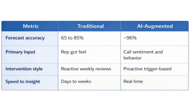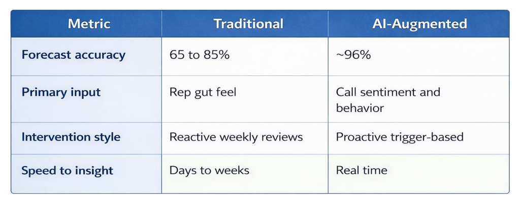 Gartner research shows AI-augmented forecasting reduces forecast error by up to 50%. Deal health signals like talk-time ratios, number of stakeholders involved, and executive presence on calls give revenue leaders the visibility that quarterly reviews simply cannot provide.