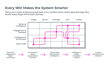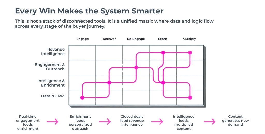 This is not a stack of disconnected tools. It is a unified architecture where data and logic flow across every stage of the buyer journey, and every win makes the system smarter.