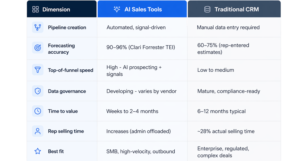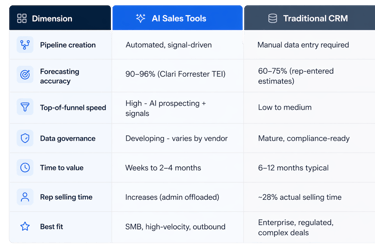TL;DR - Short on time? AI tools win on pipeline speed and forecasting accuracy. CRMs win on compliance and deal complexity. Most teams need both. The real question isn't which is better - it's which problem you actually have. Skip to the 3-Signal Audit if you're ready to diagnose, or the Decision Framework if you're ready to choose