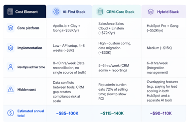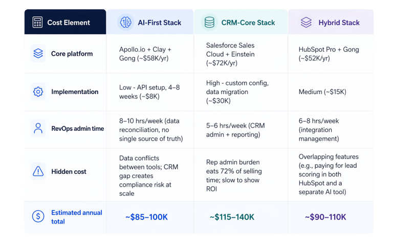 The verdict: On pure software cost, AI-first stacks often win for teams under 30 reps. Above 50 reps, the admin and compliance overhead of not having a mature CRM usually outweighs the licence savings - and the hybrid stack becomes the lowest total-cost option when implementation is factored in