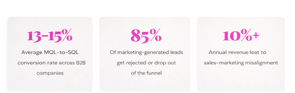 Marketing is incentivized on lead count. Sales is incentivized on the close rate. These two metrics are structurally opposed. When marketing dumps leads to hit their monthly quota, sales waste up to 60% of their time on accounts that will never buy.