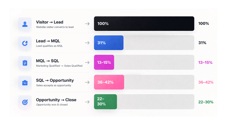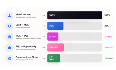 Example: 15 SQLs from 100 MQLs = 15% conversion rate